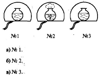 7. Какое вещество — вода, ртуть, свинец — будет жидким при температуре 400 °С? а) Вода. б) Ртуть. в) Свинец. г) Никакое. 8. Какое вещество — кислород, эфир, молоко — будет находиться при 0 °С в виде пара? а) Кислород. б) Эфир. в) Молоко. г) Здесь не названо такое вещество. 9. Как температура кипения жидкости зависит от давления воздуха? а) При увеличении давления температура кипения жидкости понижается. б) При уменьшении давления температура кипения повышается. в) При уменьшении давления температура кипения понижается. 10. Под стеклянным колоколом насоса находятся колбы с водой, температура которой близка к 100 °С. Из-под одного колокола воздух откачивают, другой соединен с атмосферой, а под третий его накачивают. Из-под какого колокола воздух откачивается?