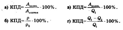 II. Изменение агрегатных состояний вещества Работа пара и газа при расширении (окончание)7. Наличие каких составных частей обязательно для работы теплового двигателя? а) Рабочего тела — пара или газа. б) Камеры сгорания топлива или парового котла с топкой. в) Отвода отработанного пара или газа. г) Нагревателя, рабочего тела, холодильника. 8. Какая физическая величина характеризует экономичность двигателя? а) Произведенная двигателем механическая работа. б) Его мощность. в) Коэффициент полезного действия двигателя. г) Количество теплоты, полученное при сгорании топлива. 9. Коэффициент полезного действия — это физическая величина, равная... а) ...совершенной двигателем полезной работе. б) .. .отношению произведенной двигателем полезной рабоггы к полученной от нагревателя энергии. в) ...количеству теплоты, выделенной при сгорании топлива. 10. По каким формулам находят коэффициент полезного действия теплового двигателя?