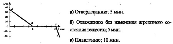 Итоговый тест 2 Изменение агрегатных состояний вещества. II вариант1. Известно, что олово находится при температуре 232 °С. Плавится оно или отвердевает? а) Частично плавится, частично отвердевает. б) Если получает энергию, то плавится, если отдает — отвердевает. в) Плавится, но иногда отвердевает в зависимости от его количества. 2. Максимальная температура, на которую рассчитана плавильная печь, 3000 °С. Какой металл — железо, вольфрам, алюминий — нельзя в ней расплавитъ? а) Железо. б) Вольфрам. в) Алюминий. 3. Какому процессу изменения агрегатного состояния воды соответствует представленный на рисунке график? Какой длительности интервал времени занял этот процесс?