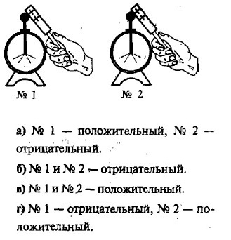 III. Электрические явления (Часть 1) Электроскоп. Проводники и непроводники электричества1. Электроскоп — это прибор для... а) ...изучения электрических явлений. б) ...обнаружения электрических зарядов. в) ...электризации тел. г) ...обнаружения взаимодействия электрических зарядов. 2. Чем электрометр отличается от электроскопа? а) Ничем. б) Принципом действия. в) Массой. г) Наличием вместо, «лепестков» стрелки, перемещающейся по шкале. 3. Заряды какого знака находятся на электроскопах № 1 и № 2, если их лепестки расположились так, как показано на рисунке? (Пунктиром обозначено их первоначальное положение.)