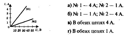 2. К источнику тока подключены последовательно соединенные лампа и реостат. Где следует включить в этой цепи амперметр, чтобы измерить силу тока в реостате? а) Между лампой и реостатом. б) Между источником тока и реостатом. в) Между реостатом и ключом. г) В любом месте цепи. 3. В каких единицах измеряется электрическое напряжение? а) В джоулях (Дж). б) В амперах (А). в) В омах (Ом). г) В вольтах (В). 4. На каком из участков электрической цепи ток совершит наименьшую работу, если на первом из них напряжение равно 20 В, на втором — 10 В и на третьем — 60 В? а) На первом. б) На втором. в) На третьем. 5. Выясните по приведенным здесь графикам зависимости сил тока в двух цепях, чему равны силы тока в них при напряжении на их концах 30 В.