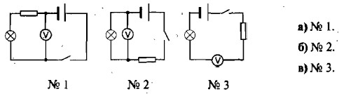 4. Нужно измерить напряжение на электролампе. Какой из представленных здесь схем можно воспользоваться для этого?