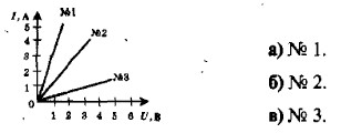 5. Какая физическая величина характеризует электропроводность цепи? а) Сила тока. б) Работа тока. в) Сопротивление. г) Напряжение. 6. На рисунке показаны три трафика зависимости силы тока от напряжения. Какой из них построен для цепи, обладающей наименьшим сопротивлением?