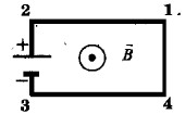 2. Электрическая цепь, состоящая из четырех прямолинейных горизонтальных проводников (1-2, 2-3, 3-4, 4-1) и источника постоянного тока, находится в Однородном магнитном поле, вектор магнитной индукции которого В направлен вертикально вцерх (см. рисунок, вид сверху). Куда направлена сила, действующая на проводник 1-2?