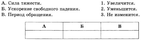 A. 0,15. Б. 0,25. B. 0,5. Г. 0,75. 5. Искусственный спутник Земли вращается на околоземной орбите. Как изменятся сила тяжести, ускорение свободного падения и период обращения спутника, если уменьшить радиус орбиты, а скорость движения спутника оставить прежней? Ответ впишите в таблицу.