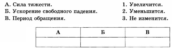 A. 25 Н/м. Б. 50 Н/м. B. 250 Н/м. Г. 2500 Н/м. 4. Тело равномерно движется по горизонтальной поверхности под действием силы 80 Н. Коэффициент трения 0,4. Чему равна масса тела? A. 5 кг. Б. 10 кг. B. 20 кг. Г. 200 кг. 5. Искусственный спутник Земли вращается на околоземной орбите. Как изменятся сила тяжести, ускорение свободного падения и период обращения спутника, если радиус орбиты уменьшить, а скорость движения спутника увеличить? Ответ впишите в таблицу.