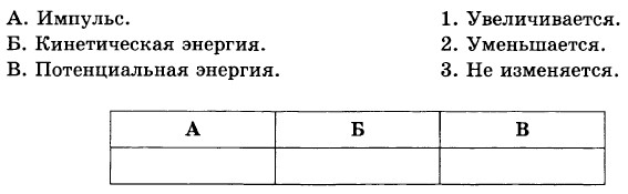 A. 0,3 кг • м/с. Б. 1,5 кг • м/с. B. 3 кг • м/с. Г. 30 кг • м/с. 2. Для того чтобы уменьшить потенциальную энергию поднятого над землёй тела в 8 раз, надо высоту, на которой находится тело, A. увеличить в 4 раза. Б. уменьшить в 4 раза. B. увеличить в 8 раз. Г. уменьшить в 8 раз. 3. Мощность двигателя грузового автомобиля равна 120 кВт. Сила тяги равна 16 кН. С какой скоростью движется автомобиль? A. 8 м/с. Б. 20 м/с. B. 25 м/с. Г. 80 м/с. 4. Волна с частотой 5 Гц распространяется по поверхности воды со скоростью 8 м/с. Чему равна длина волны? A. 1,6 м. Б. 4 м. B. 16 м. Г. 80 м. 5. Установите соответствие между физическими величинами и характером их изменения. Ответ впишите в таблицу. Тело падает вертикально вниз. Что происходит при этом с импульсом, с кинетической и потенциальной энергией, характеризующими тело?