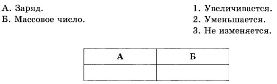 Контрольная работа № 4 Атомы и звёзды. Вариант 11. Какие утверждения соответствуют планетарной модели атома? A. Заряд ядра положителен, размеры ядра малы по сравнению с диаметром электронных орбит. Б. Заряд ядра отрицателен, размеры ядра малы по сравнению с диаметром электронных орбит. B. Заряд ядра положителен, размеры ядра сравнимы с диаметром электронных орбит. Г. Заряд ядра отрицателен, размеры ядра сравнимы с диаметром электронных орбит. 2. Каков состав ядер лития A. 3 нейтрона, 4 протона. Б. 4 нейтрона, 3 протона. B. 3 протона, 7 нейтронов. Г. 4 протона, 7 нейтронов. 3. Альфа-излучение — это поток A. электронов. Б. протонов. B. ядер гелия. Г. нейтронов. 4. Укажите второй продукт ядерной реакции A. n. Б. р. B. β-частица. Г. 5. Для каждой величины определите соответствующий характер изменения. Ответ впишите в таблицу. Как изменяются указанные характеристики атомного ядра в результате его β-распада?
