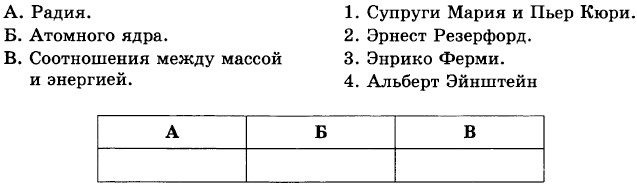 Контрольная работа № 4 Атомы и звёзды. Вариант 21. Какой вывод сделал Резерфорд на основании исследования рассеяния α-частиц при прохождении через вещество? A. Альфа-частицы являются ядрами атомов гелия. Б. Альфа-распад является процессом самопроизвольного превращения ядра одного химического элемента в ядро другого элемента. B. Внутри атомов имеются положительно заряженные ядра очень малых размеров, вокруг ядер движутся электроны. Г. При α-распаде атомных ядер выделяется значительно большая энергия, чем в любых химических реакциях (в расчёте на один атом). 2. Каков состав ядер урана A. 92 нейтрона, 146 протонов. Б. 146 нейтронов, 92 протона. B. 238 протонов, 146 нейтронов. Г. 146 протонов, 238 нейтронов. 3. При попадании теплового нейтрона в ядро урана происходит деление ядра. Какие силы разгоняют осколки ядра? A. Гравитационные. Б. Электрические. B. Ядерные. Г. Магнитные. 4. Укажите второй продукт ядерной реакции A. n. Б. р. B. β-частица. Г. 5. Установите соответствие между научными открытиями и именами учёных, которые сделали эти открытия.