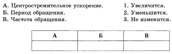 5. Установите соответствие между физическими величинами и характером их изменения. Ответ впишите в таблицу. Шарик равномерно движется по окружности. Как изменятся центростремительное ускорение, период и частота обращения шарика, если его скорость увеличить, а радиус окружности оставить прежним?