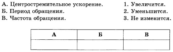 5. Установите соответствие между физическими величинами и характером их изменения. Ответ впишите в таблицу. Шарик равномерно движется по окружности. Как изменятся центростремительное ускорение, период и частота обращения шарика, если его скорость уменьшить, а радиус окружности оставить прежним?