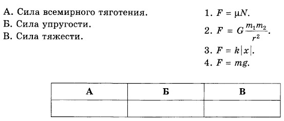 Контрольная работа № 2 Законы Ньютона. Силы в механике. Вариант 21. Систему отсчёта, связанную с землёй, будем считать инерциальной. Система отсчёта, связанная с мотоциклом, тоже будет инерциальной, если мотоцикл A. движется равномерно по прямолинейному участку дороги. Б. разгоняется по прямолинейному участку дороги. B. тормозит на прямолинейном участке дороги. Г. делает поворот с постоянной по модулю скоростью. 2. Тело массой 500 г движется с ускорением 4 м/с2. Чему равен модуль равнодействующей приложенных к телу сил? A. 1 Н. Б. 2 Н. B. 20 Н. Г. 2000 Н. 3. К пружине динамометра жёсткостью 40 Н/м подвешен груз массой 200 г. Насколько при этом растянулась пружина? A. 2,5 см. Б. 5 см. B. 25 см. Г. 50 см. 4. Тело массой 4 кг равномерно движется по горизонтальной плоскости. Сила тяги при этом равна ЮН. Чему равен коэффициент трения? A. 0,2. Б. 0,25. B. 0,75. Г. 0,8. 5. Установите соответствие между названиями сил и формулами, по которым можно находить эти силы. Ответ впишите в таблицу.