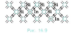 Акцепторные примеси. Если в качестве примеси использовать индий, атомы которого трёхвалентны, то характер проводимости полупроводника меняется. Для образования нормальных парноэлектронных связей с соседями атому индия недостаёт одного электрона, который он берёт у соседнего атома кристалла. В результате образуется дырка. Число дырок в кристалле равно числу атомов примеси (рис. 16.9).