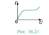 Казалось бы, сила тока и при дальнейшем увеличении разности потенциалов должна оставаться неизменной. Однако опыт показывает, что в газах при увеличении разности потенциалов между электродами, начиная с некоторого её значения, сила тока снова возрастает (рис. 16.31). Это означает, что в газе появляются дополнительные ионы помимо тех, которые образуются за счёт действия ионизатора. Сила тока может возрасти в сотни и тысячи раз, а число ионов, возникающих в процессе разряда, может стать таким большим, что внешний ионизатор будет уже не нужен для поддержания разряда. Если убрать внешний ионизатор, то разряд может не прекратиться.
