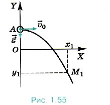 При сделанном выборе начала координат и направлений осей ОХ и OY имеем х0 = 0, у0 = |ОА|, υ0x = υ0, υ0y = 0, ах = О, ау = -g. Поэтому х = υ0t,