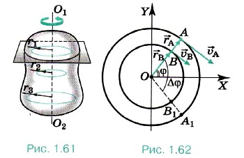 Угловая скорость. Каждая точка тела, вращающегося вокруг неподвижной оси, проходящей через точку О, движется по окружности, и различные точки проходят за время Δt разные пути. Так, АА1 > ВВ1 (рис. 1.62), поэтому модуль скорости точки А больше, чем модуль скорости точки В. Но радиус-векторы, определяющие положение точек А и В, поворачиваются за время Δt на один и тот же угол Δφ. Угол φ — угол между осью ОХ и радиус-вектором Пусть тело вращается равномерно, т. е. за любые равные промежутки времени радиус-векторы поворачиваются на одинаковые углы. Чем больше угол поворота радиус-вектора, определяющего положение какой-то точки твёрдого тела, за определённый промежуток времени, тем быстрее вращается тело и тем больше его угловая скорость.