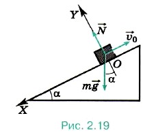 Задача 2. В результате полученного толчка брусок начал скользить вверх по наклонной плоскости из точки О с начальной скоростью υ0 = 4,4 м/с. Определите положение бруска относительно точки О через промежуток времени t1 — 2 с после начала его движения, если угол наклона плоскости к горизонту α = 30°. Трение не учитывайте. Р е ш е н и е. Поскольку требуется найти положение бруска относительно точки О, начало координат возьмём в этой точке. Ось X направим вдоль наклонной плоскости вниз, а ось Y — перпендикулярно этой плоскости вверх (рис. 2.19). При движении бруска на него действуют две силы: сила тяжести m Согласно второму закону Ньютона m