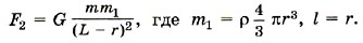 Задача 3. На поверхности Земли находятся два свинцовых шара радиусом R = 10 см каждый. В одном из них вырезана сферическая полость, как показано на рисунке 3.7. Радиус полости r = 5 см, центр полости находится на расстоянии l = 5 см от центра шара. Определите силу гравитационного притяжения шаров. Центры шаров находятся на расстоянии L = 40 см. Р е ш е н и е. Если бы у правого шара не было вырезанной полости, то сила гравитационного притяжения шаров была бы равна
