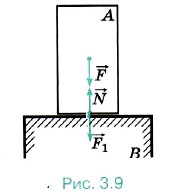 Пусть тело А находится на горизонтальной опоре В (рис. 3.9), которой может служить чашка весов. Силу тяжести обозначим через , а силу давления тела на опору (вес) — через 1. Модуль силы реакции опоры равен модулю веса 1 согласно третьему закону Ньютона. Сила направлена в сторону, противоположную весу 1 Сила реакции опоры приложена не к опоре, а к находящемуся на ней телу.