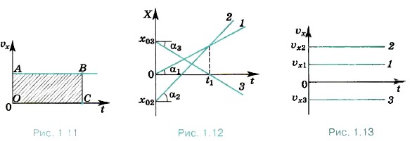 На рисунке 1.12 приведены примеры графиков зависимости координаты от времени для трёх различных случаев равномерного прямолинейного движения. Прямая 1 соответствует случаю х0 = 0, υx1 > 0; прямая 2 — случаю х0 < 0, υx2 > 0, а прямая 3 — случаю х0 > 0, υx3 < 0. Угол наклона α2 прямой 2 больше, чем угол наклона α1 прямой 1. За один и тот же промежуток времени t1 точка, движущаяся со скоростью υx2, проходит большее расстояние, чем при движении её со скоростью υx1. Следовательно, скорость υx2 больше, чем скорость υx1. Проекция скорости определяет угол наклона прямой к оси t. Очевидно, проекция скорости υx численно равна тангенсу угла α. В случае 3 α3 < 0, движение происходит в сторону, противоположную оси ОХ. На рисунке 1.13 представлены зависимости проекций скоростей от времени для случаев 1, 2 и 3.