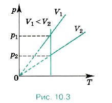 Разным объёмам соответствуют разные изохоры. Также проведём на рисунке произвольную изотерму (рис. 10.3). С ростом объёма газа при постоянной температуре давление его, согласно закону Бойля— Мариотта, падает. Поэтому изохора, соответствующая большему объёму V2, лежит ниже изохоры, соответствующей меньшему объёму V1. В соответствии с уравнением (10.10) все изохоры идеального газа начинаются в точке Т = 0. Значит, давление идеального газа при абсолютном нуле равно нулю. Увеличение давления газа в любом сосуде или в электрической лампочке при нагревании можно считать изохорным процессом. Изохорный процесс используется в газовых термометрах постоянного объёма.