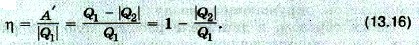 Согласно закону сохранения энергии работа, совершаемая двигателем, равна: А' = Q1 - |Q2|, (13.15) где Q1 — количество теплоты, полученной от нагревателя, a Q2 — количество теплоты, отданной холодильнику.