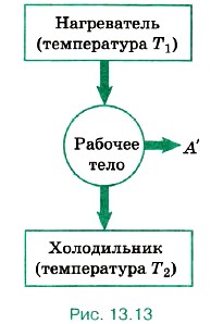 Эта часть внутренней энергии топлива теряется. Тепловой двигатель совершает работу за счёт внутренней энергии рабочего тела. Причём в этом процессе происходит передача теплоты от более горячих тел (нагревателя) к более холодным (холодильнику). Принципиальная схема теплового двигателя изображена на рисунке 13.13. Рабочее тело двигателя получает от нагревателя при сгорании топлива количество теплоты Q1, совершает работу А' и передаёт холодильнику количество теплоты Q2 < Q1. Для того чтобы двигатель работал непрерывно, необходимо рабочее тело вернуть в начальное состояние, при котором температура рабочего тела равна Т1. Отсюда следует, что работа двигателя происходит по периодически повторяющимся замкнутым процессам, или, как говорят, по циклу.