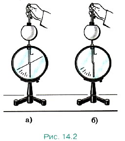Опустив обе пластины внутрь сферы, мы вообще не обнаружим отклонения стрелки (рис. 14.2, б). Это доказывает, что заряды пластин равны по модулю и противоположны по знаку.