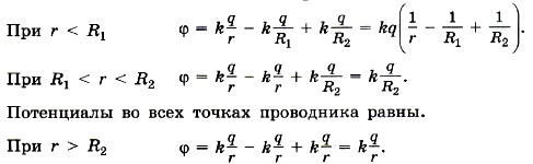 Согласно принципу суперпозиции потенциал любой точки поля складывается из потенциала поля заряда q, проводящей сферы радиусом R1, с зарядом -q и проводящей сферы радиусом R2 с зарядом +q.