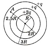 C4. Три концентрические сферы радиусами R, 2R и 3R (см. рис.) имеют равномерно распределённые по их поверхностям заряды q1 = +2q, q2 = +q, q3 = +q соответственно. Известно, что точечный заряд q создаёт на расстоянии R электрическое поле с потенциалом φ1 = 100 В. Чему равен потенциал в точке А, отстоящей от центра сфер на расстоянии RA = 2,5R?