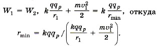 Р е ш е н и е. Энергия протона на расстоянии r1 равна сумме его потенциальной и кинетической энергий: на расстоянии rmin (протон останавливается) — только потенциальной энергии: