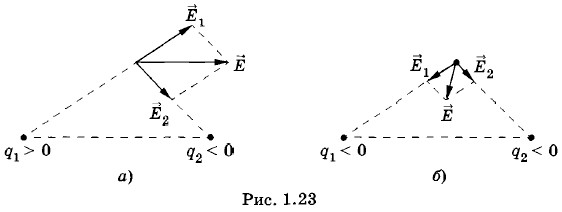 Благодаря принципу суперпозиции для нахождения напряженности поля системы точечных зарядов в любой точке достаточно знать выражение (1.9.5) для напряженности поля точечного заряда. На рисунке 1.23, а, б показано, как геометрически определяется напряженность Е поля, созданного двумя зарядами.