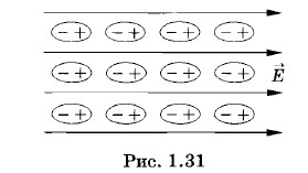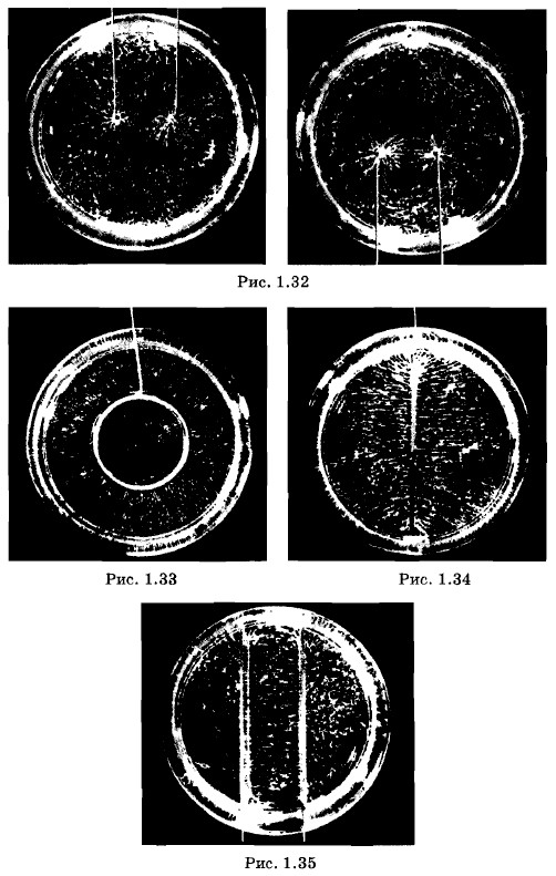 Частицы поворачиваются во внешнем поле вдоль линий напряженности, и заряды на их концах взаимодействуют друг с другом. Разноименные заряды притягиваются, а одноименные отталкиваются. В результате частицы диэлектрика выстраиваются вдоль силовых линий (рис. 1.31). На рисунках 1.32—1.35, сделанных с фотографий, показаны полученные таким образом картины линий напряженности полей около проводников различной формы (рис. 1.32, а, б — два стержня с одинаковыми зарядами и два стержня с противоположными по знаку и равными по модулю зарядами; рис. 1.33 — заряженный цилиндр (поле внутри цилиндра отсутствует); рис. 1.34 — заряженная плоскость; рис. 1.35 — две плоскости с одинаковыми по модулю и противоположными по знаку зарядами).