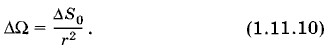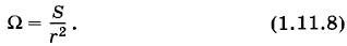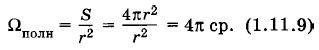 Нетрудно видеть, что значение телесного угла не зависит от радиуса сферы, так как площадь S вырезаемой им площадки пропорциональна квадрату радиуса. За единицу телесного угла принят стерадиан (ср) — это телесный угол с вершиной в центре сферы, вырезающий на поверхности сферы элемент, площадь которого равна квадрату радиуса сферы. Полный телесный угол, охватывающий все пространство вокруг точки, равен: