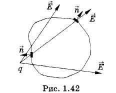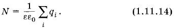 Если замкнутая поверхность не содержит внутри себя электрического заряда, то поток напряженности через нее равен нулю (рис. 1.42). Силовые линии, идущие от заряда q, либо не пересекают ее совсем, либо же пересекают четное число раз. При этом число линий, выходящих из поверхности, равно числу линий, входящих в нее, и поэтому N = 0. (Выходящие из поверхности линии вносят положительный вклад в поток, а входящие — отрицательный.) Обобщение теоремы ГауссеТеорема Гаусса легко обобщается на случай любого числа точечных зарядов. Поток напряженности через поверхность площадью S для каждого заряда определяется формулой (1.11.12). Вследствие принципа суперпозиции полей полный поток равен сумме потоков от всех зарядов. Поэтому, суммируя выражения (1.11.12) для всех зарядов, найдем: