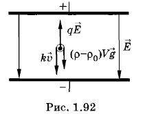 где а — радиус капельки; V — ее объем; ρ — плотность масла; ρ0 — плотность воздуха. Здесь учитывается выталкивающая сила, действующая на капельку со стороны воздуха. При создании электрического поля (рис. 1.92) уравнение установившегося движения капельки примет форму