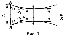 8. Согласно условию задачи электроны вначале будут сближаться, двигаясь по траекториям одинаковой формы. Эти траектории симметричны относительно оси X, проходящей через середину отрезка АВ и расположенной перпендикулярно к нему (рис. 1). После сближения на минимальное расстояние r электроны начнут удаляться друг от друга. Вследствие симметрии на минимальном расстоянии электроны имеют одинаковые скорости й, параллельные оси X. Эта скорость определяется Из закона сохранения импульса: