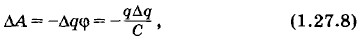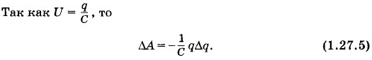 Энергия произвольного конденсатораФормулы (1.27.3) справедливы для энергии любого конденсатора, а не только плоского. Докажем это, используя более общий метод вычисления энергии. Зарядку конденсатора в принципе можно осуществить так. Будем постепенно малыми порциями -Δq переносить отрицательный заряд с одной пластины на другую. При этом конденсатор будет заряжаться, а электрическое поле внутри него совершать работу. Если порция заряда -Δq мала, то можно считать, что напряжение U = φ1 - φ2 между его пластинами во время переноса заряда не меняется. Тогда работа ΔА, согласно формуле (1.19.8), равна: ΔA = -ΔqU. (1.27.4)
