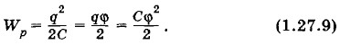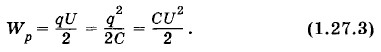 Эта энергия равна работе, которую совершит электрическое поле при сближении пластин вплотную. Заменив в формуле (1.27.2) либо разность потенциалов, либо заряд с помощью выражения (1.25.1) для емкости конденсатора, получим: