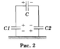 1. Будет. Каждая из пластин обладает определенной, обычно небольшой, емкостью относительно Земли. (Это происходит из-за того, что вблизи краев пластин линии напряженности искривляются и достигают Земли.) Эквивалентная схема показана на рисунке 2. Емкость пластин относительно Земли изображена в виде конденсаторов С1 и С2. При заземлении левой пластины нейтрализуется часть заряда, находящегося на ней. Это же произойдет при заземлении правой пластины. Конденсатор будет разряжаться тем медленнее, чем больше емкость конденсатора по сравнению с емкостью каждой пластины относительно земли.