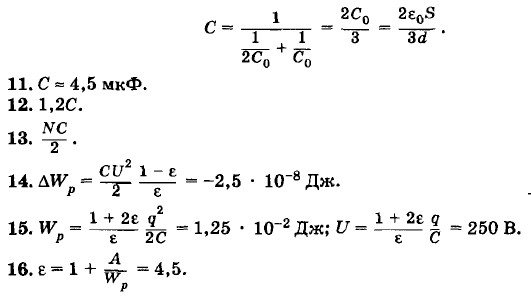 17. К ошибочному результату мы пришли потому, что не учли одно из фундаментальных свойств электростатического поля — его потенциальный характер: работа сил поля при перемещении заряженной частицы по замкнутой траектории равна нулю. При движении заряженной частицы внутри конденсатора электрическое поле ускоряет, а вне конденсатора — тормозит ее, и, когда частица подлетает к отверстию в верхней пластине, ее энергия принимает прежнее значение. Это означает, что в рассматриваемом примере мы не можем пренебрегать электростатическим полем вне плоского конденсатора. Оно, правда, значительно слабее поля между обкладками, но в нем частица пролетает гораздо больший путь. В результате в тормозящем поле вне конденсатора частица теряет как раз ту энергию, которую приобретает внутри конденсатора. 18. Энергия конденсаторов до соединения была равна: