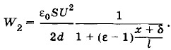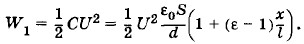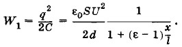 если пренебречь величиной 8 в знаменателе. Примечание. В то время как при подсчете энергии мы считали, что поле внутри конденсатора однородно, и пренебрегали краевыми эффектами для физического объяснения происхождения силы, действующей на диэлектрик, обязательно надо учитывать неоднородность поля у краев. 20. Энергия конденсатора в случае, когда диэлектрик втянулся на расстояние х внутрь конденсатора, равна: