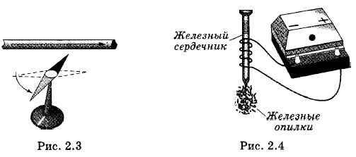 Электрический ток возникает не только при упорядоченном движении свободных электронов в металле, но и при упорядоченном движении положительных и отрицательных ионов в водных растворах и расплавах электролитов (солей, кислот, щелочей), ионов и электронов в газах, при падении заряженных капель дождя, при движении заряженного эбонитового стержня и т. д. Однако если перемещать нейтральное в целом тело, то, несмотря на упорядоченное движение огромного числа электронов и атомных ядер, электрический ток не возникнет, так как полный (суммарный) заряд, переносимый через любое сечение, будет равен нулю. Электрический ток существует лишь в том случае, когда имеет место движение нескомпенсированного (избыточного) положительного или отрицательного заряда. Следует ясно себе представлять, что такое упорядоченное движение заряженных частиц. При упорядоченном движении заряженные частицы могут участвовать и в тепловом движении, т. е. двигаться хаотически. На беспорядочные смещения частиц накладываются перемещения в каком-либо определенном направлении. Грубо упорядоченное движение заряженных частиц можно уподобить облаку беспорядочно толкущейся мошкары, которое перемещается в определенном направлении под действием ветра. Направление электрического токаЭлектрическому току приписывают определенное направление. За направление тока принимают направление движения положительно заряженных частиц. Поэтому если ток образован движением отрицательно заряженных частиц, то направление тока считают противоположным направлению движения частиц. Такой выбор направления тока не очень удачен, так как в большинстве случаев ток представляет собой движение электронов — отрицательно заряженных частиц. Выбор направления тока был сделан в то время, когда о свободных электронах в металлах еще ничего не знали. Действия токаДвижение заряженных частиц в проводнике мы не видим. Однако о наличии электрического тока можно судить по различным явлениям, которые вызывает электрический ток. Такие явления называются действиями электрического тока. Во-первых, проводник, по которому течет ток, нагревается. Это тепловое действие тока. Именно благодаря тепловому действию тока происходит нагрев спирали в электроплитке, утюге, раскаляется добела вольфрамовая нить в электрической лампочке. Однако соединительные провода в электрических цепях почти не нагреваются током. Причина этого будет объяснена в § 2.9. Во-вторых, электрический ток может изменять химический состав проводника. Это химическое действие тока. Например, при прохождении тока через раствор медного купороса из раствора выделяется медь, а при прохождении тока через подкисленную воду она разлагается на водород и кислород. В-третьих, ток оказывает магнитное действие. Расположенная вдоль проводника с током магнитная стрелка поворачивается перпендикулярно проводнику (рис. 2.3) (это впервые было обнаружено датским физиком X. Эрстедом в 1820 г.). Если изолированную проволоку намотать на железный гвоздь, то он становится магнитом и притягивает железные опилки (рис. 2.4). Магнитное действие тока лежит в основе работы электрических двигателей, генераторов, трансформаторов, электрических измерительных приборов и т. д.
