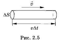 Введем понятие плотности электрического тока для наиболее простого случая упорядоченного движения одинаковых заряженных частиц. Выделим в среде, в которой существует ток, очень малый объем в форме прямого цилиндра с площадью основания ΔS (рис. 2.5). Цилиндр ориентирован так, что его основания перпендикулярны скорости упорядоченного движения частиц