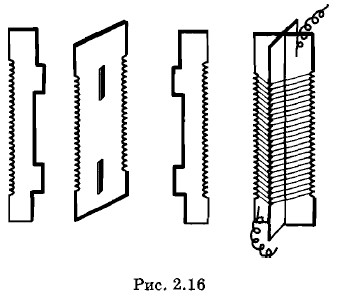 Зависимость сопротивления металлов от температуры используется в термометрах сопротивления. Самый простой термометр сопротивления — это намотанная на слюдяную пластинку тонкая платиновая проволока (рис. 2.16), зависимость сопротивления которой от температуры хорошо известна. Термометр сопротивления приводят в тепловой контакт с телом, температуру которого желают измерить (например, помещают в печь), а концы обмотки включают в цепь. Измеряя сопротивление обмотки, можно определить температуру. Такие термометры позволяют измерять очень низкие и очень высокие температуры, когда обычные жидкостные термометры непригодны.