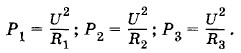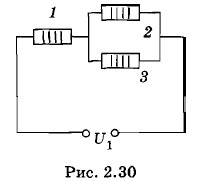 Три нагревательных прибора мощностью Р1 = 50 Вт, Р2 = 25 Вт и Р3 = 50 Вт, рассчитанные на напряжение U = 110 В каждый, соединены, как показано на рисунке 2.30, и включены в сеть с напряжением U1 = 2U = 220 В. Определите мощность, выделяемую каждым нагревательным прибором. Решение. Номинальные мощности приборов, согласно формуле (2.7.7), равны соответственно: