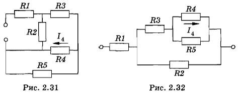 Задача 6В цепи, схема которой изображена на рисунке 2.31, сопротивления всех резисторов известны и равны соответственно R1 = 2 Ом, R2 = 5 Ом, R3 = 2 Ом, R4 = 40 Ом, R5 = 10 Ом. Сила тока в резисторе R4 I4 = 0,5 А. Определите силу тока во всех остальных резисторах и напряжение на зажимах цепи. Решение. Решение задачи значительно облегчается, если приведенную на рисунке 2.31 схему заменить эквивалентной (рис. 2.32).