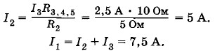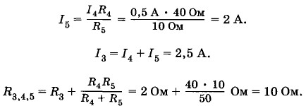 Напряжение на зажимах цепи U = I1R1 + I2R2 = 7,5 А • 2 Ом + 5 А • 5 Ом = 40 В. Итак, I1 = 7, 5 А; I2 = 5 А; I3 = 2,5 А; I5 = 2 A; U = 40 В.