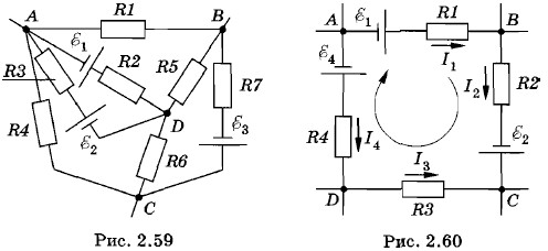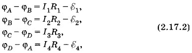 Глава 2. Постоянный электрический ток § 2.17. Расчет сложных электрических цепейВ общем случае электрическая цепь может быть образована несколькими источниками тока и резисторами, соединенными произвольным образом, например так, как показано на рисунке 2.59. Такая цепь называется сложной разветвленной электрической цепью. Сложную электрическую цепь можно разбить на ряд отдельных замкнутых контуров (см. рис. 2.59): ABDA, АВСА и т. д. Расчет таких цепей (например, нахождение сил токов во всех участках цепи) можно выполнить с помощью закона Ома. Однако во многих случаях расчет упрощается, если применить правила Кирхгофа. С первым правилом Кирхгофа (2.8.2) мы познакомились в § 2.8. Оно гласит: алгебраическая сумма сил токов в проводниках, сходящихся в узел, равна нулю. Теперь рассмотрим второе правило. Второе правило КирхгофаРассмотрим произвольно выбранный замкнутый контур ABCD (рис. 2.60). Применим к отдельным участкам этого контура закон Ома для участка цепи, содержащего источник ЭДС, в форме (2.15.3): φ1 - φ2 =Ir - Обозначим потенциалы узлов А, В, С и D соответственно через φА, φB, φC и φD. За направление обхода контура выберем направление по часовой стрелке. Тогда, согласно (2.17.1), можем написать: