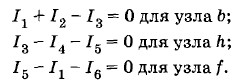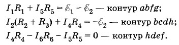 Теперь применим второе правило Кирхгофа для контуров. Выберем произвольно направление обхода контуров: контура abƒg — по часовой стрелке; контура bcdh — против часовой стрелки и контура hdeƒ — по часовой стрелке (и здесь для упрощения записей модули ЭДС источников обозначим буквами